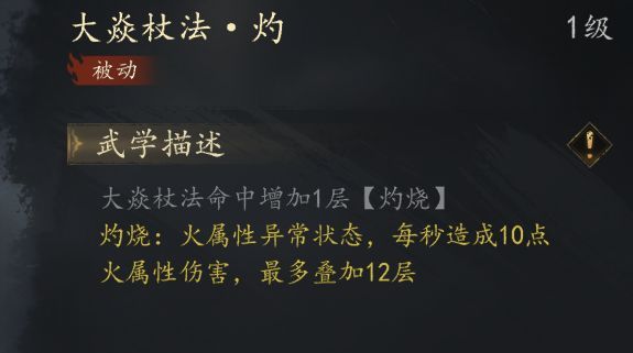 火系普攻【大焱杖法】用来叠加【灼烧】状态【灼烧】状态是玄门火系技能的独特buff,可以叠加十二层,每层可以造成10点伤害,这也使得玄门前期的输出就非常高,甚至可以只用普攻刷野
