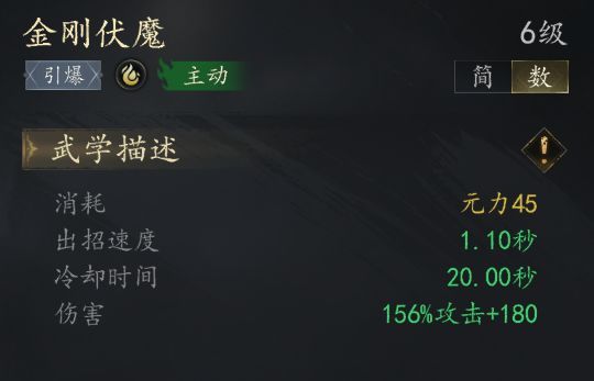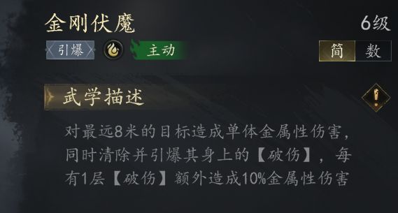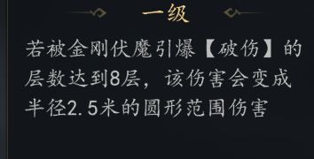 金系技能【金刚伏魔】是金系核心输出技 引爆所有【破伤】造成AOE伤害CD20秒 伤害数值为156%+破伤层数*10%+180 AOE为半径2.5米的圆