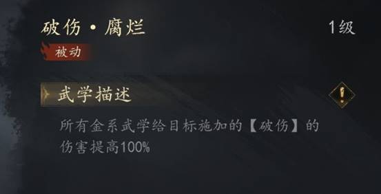 金系普攻 【铄金仗法】用来叠【破伤】层数破伤一共可以叠15层,在武学加成下每层造成32点伤害,在叠满的情况下每秒可以造成480点伤害 数值非常可观 优于【灼烧】的满层数160点伤害 因此很多玄门后期转金系