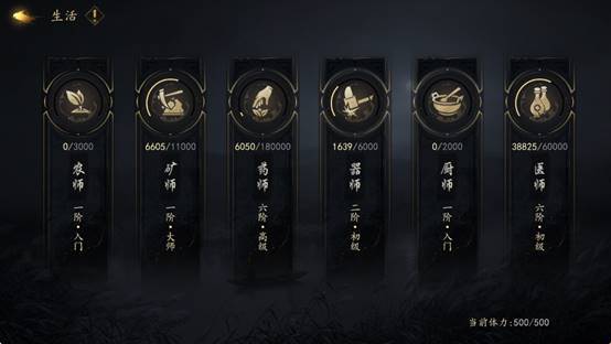 (2) 生活技能推荐:药师+医师>矿师+器师>农师+厨师。由于游戏中元力的设定,导致元力丹的需求很高,医师在5阶段及之前通过制作蓝药可以概率产出元力丹,弥补了日常元力丹消耗过大的问题。且挂机刷怪需要持续消耗血药和蓝药,日常的补给压力较大,所以不管是什么玩家都可以优先选择医师+药师的组合,等后期战力提升,消耗降低之后,可以考虑再练其他生活技能。