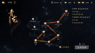 (1) 四象分为4个分支,分别为青龙,玄武,朱雀,白虎。每一个分支都有9个“星点”,每个星点都有从白→绿→蓝→紫→橙5中不同品质的各类属性,通过消耗碎星石进行星点的刷新(类似使用洗练石对装备词条进行洗练一样)。激活更多数量的紫色品质以上的星点可以激活右侧的特殊属性。锁定星点刷新,需要用到更多的碎星石。建议4个分钟进行均衡提升,以激活更高的右侧属性为目标。