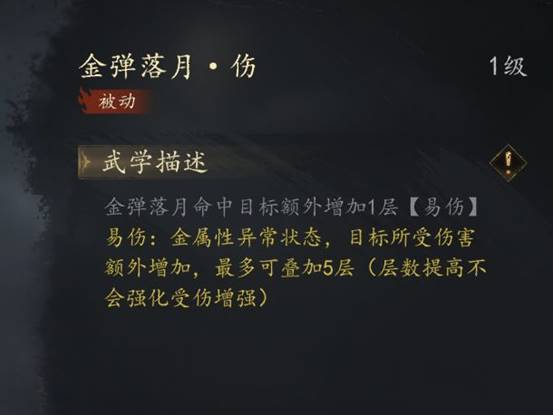金系普攻【金刃剑舞】用来挂【易伤】效果缺点和火系普攻一样 手短 但是这个普攻是不得不带的 每次普攻可以叠一次【易伤】 共能叠五层 可以让敌方一直带着【易伤】buff 这个层数虽然不能加伤 但是也非常关键 下文还会提到