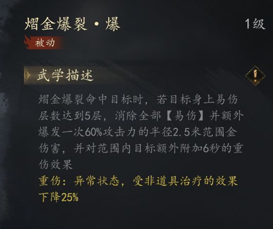 金系技能【熠金爆裂】是一个AOE技能 可以引爆所有【易伤】层数再造成一次AOE伤害 伤害范围为6*2.5米的矩形 而命中后又会造成一个2.5米半径的圆形伤害非常具有实用价值的技能 无论是清群怪还是打boss 都是两次AOE 可以说是金系的核心技能了 CD9秒 伤害为171.5%+135+60%攻击力