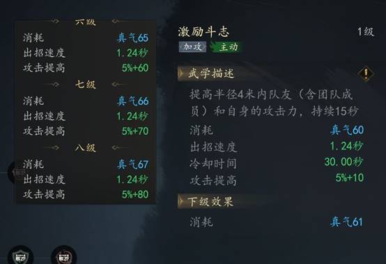 火系技能【激励斗志】可以为队伍提供5%+10*技能等级攻击力