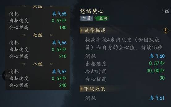 火系技能【怒焰焚心】可以为队伍提供30*技能等级会心值