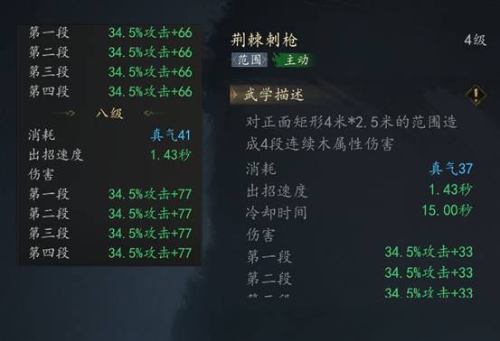 木系技能【荆棘刺枪】 中距离输出技 满级时可以造成138%攻击+308的伤害