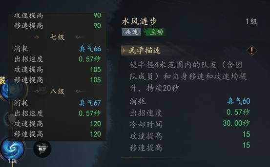 水系技能【水风涟步】可以为队伍提供15*技能等级攻速和移速