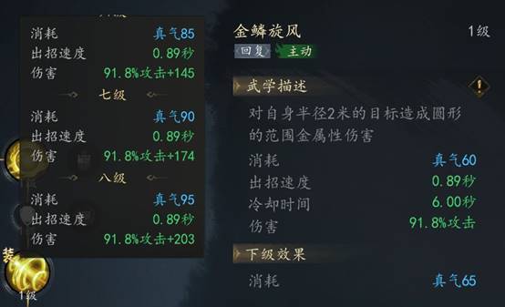 金系技能【金鳞旋风】CD6s 伤害为91.8%攻击+(技能等级-1*29