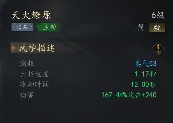 火系技能【天火燎原】属于视觉效果很强但是数值并不高的技能在此提醒各位火法,虽然说这个大陨石CD很长特效很足看起来伤害很高,实际上这个技能的伤害在后期是比不上【火莲绽放】和【炽焰连环】的 伤害数值实际上只有167.44%+240攻击 因为前期的基础攻击力很低所以说这个固定的附伤让它看起来伤害很高 实际上加成并不高