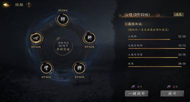(1) 升级筋脉可以给角色提供各类属性加成,升级筋脉需要消耗通络石。