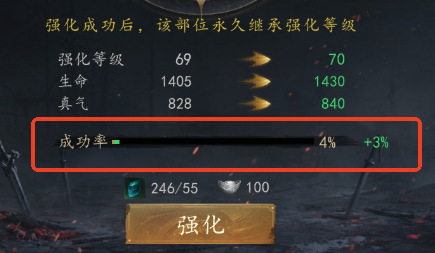 (3) 部位强化:对各个装备的部位进行强化,可以提高对应部位的装备属性加成,由于是部位强化,更换装备之后强化效果依旧保留。1-30消耗下品强化石,31-50消耗中品强化石。50-80消耗高品强化石(强化石之间无法直接转换)。强化随着等级的提升成功率会降低,每次失败都会提高成功率,强化同时还会消耗铜币或者银两。(图中4%为当前的成功率,+3%是因为之前失败额外增加的成功率,即本次成功率为4%,而不是7%哦。)