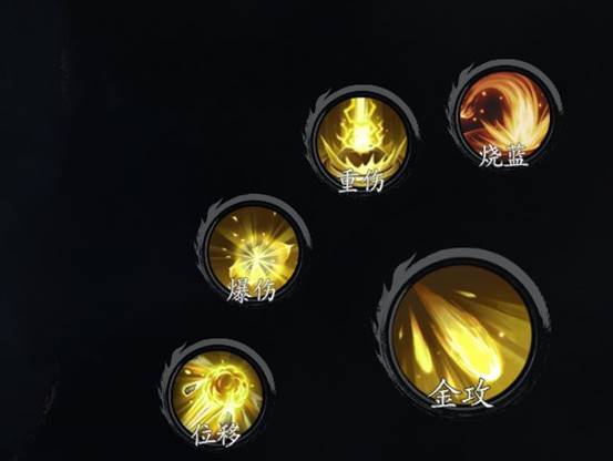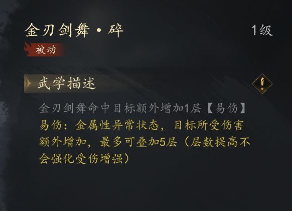 金系普攻【金刃剑舞】用来挂【易伤】效果缺点和火系普攻一样 手短 但是这个普攻是不得不带的 每次普攻可以叠一次【易伤】 共能叠五层 可以让敌方一直带着【易伤】buff 这个层数虽然不能加伤 但是也非常关键 下文还会提到