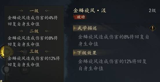 该技能的被动技能【金鳞旋风 汲】在满级时可以吸血技能伤害的18% 是游戏中为数不多的吸血技能