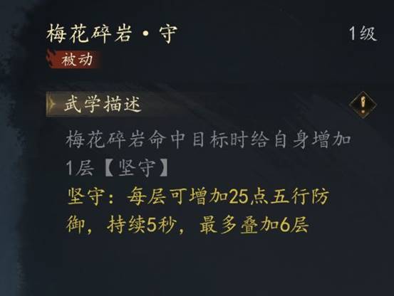 土系普攻【梅花碎岩】可以为戟盟增加25*层数五行防御,最高为150。在前期和后期都非常实用