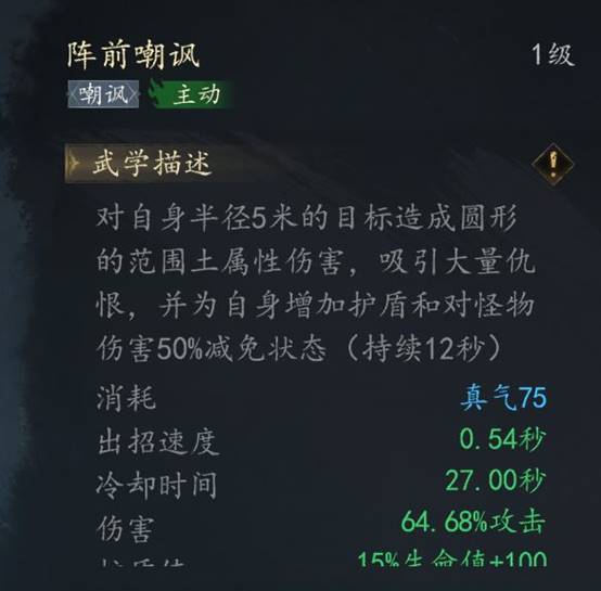 土系技能【阵前嘲讽】是非常关键的技能CD24s释放后获得15%最大生命值+技能等级*50+50的护盾值
