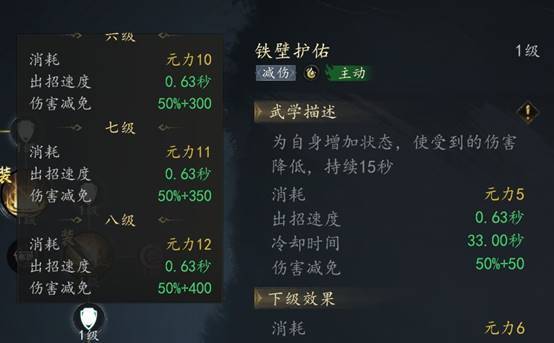 土系元力技【铁壁护佑】为免伤神技使戟盟获得50%+技能等级*50的免伤效果 配合【阵前嘲讽】效果极佳